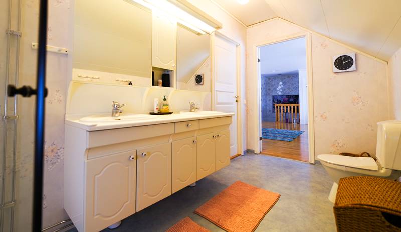 - Badrummet: Ett fullt utrustat badrum (dubbelhandfat, dusch, toalett) med fräscha handdukar och kostnadsfria toalettartiklar.